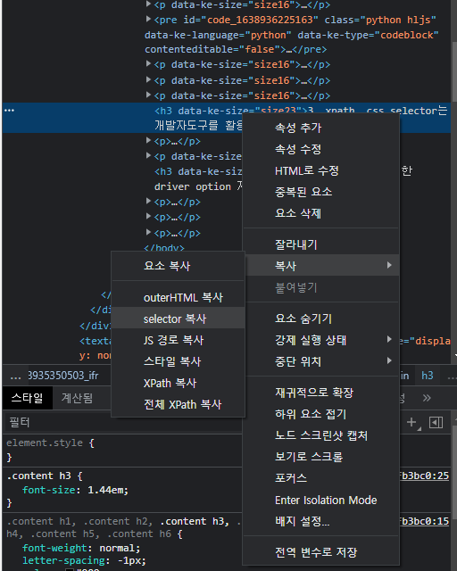 원하는 element 우클릭 > 복사 > selector 복사 클릭 시 css selector가, XPath 복사 클릭 시 xpath 값이 복사된다. 해당 값을 사용하면 부족함없이 사용할 수 있을 것이다.