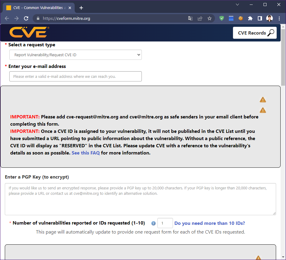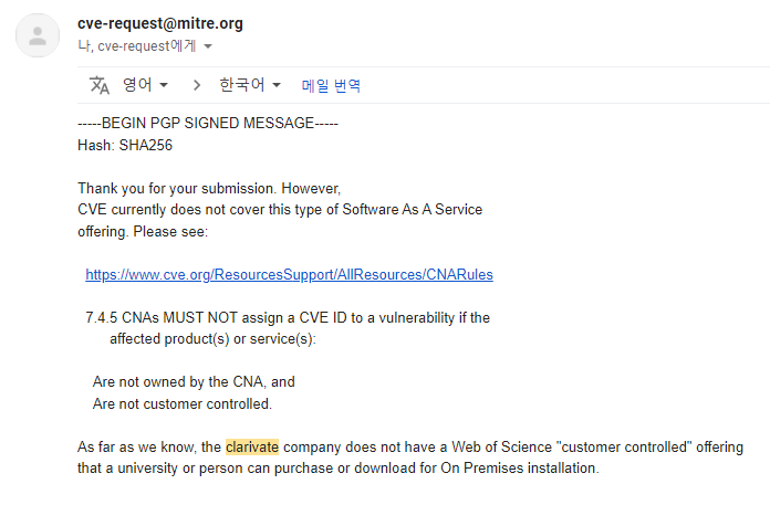 취약점 보고 후, CVE 넘버를 부여받기 위해 CVE 제출을 위해 양식을 작성하고 이메일 회신을 기다렸다.